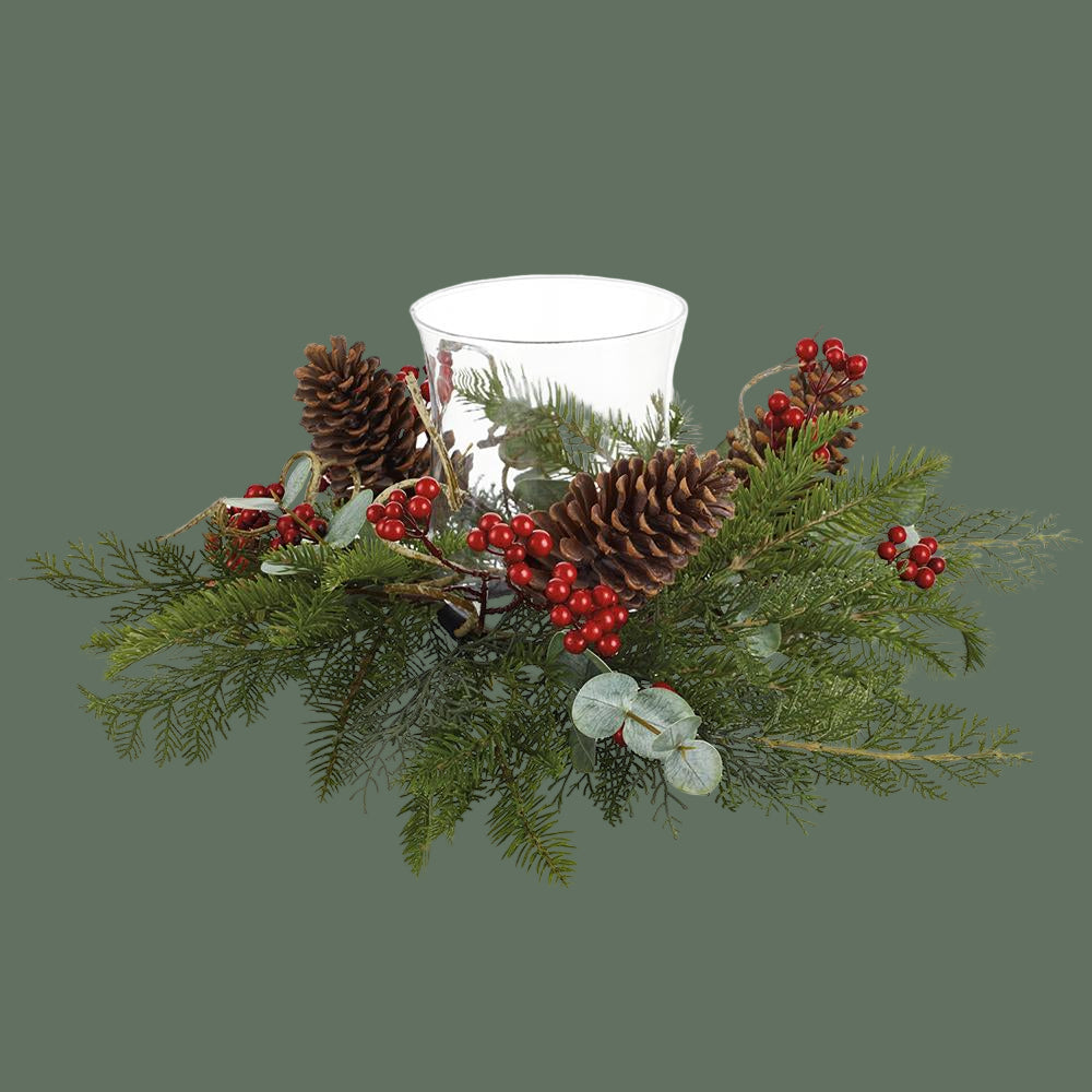 Berry & Pine Cone Centerpiece With Glass Candleholder 21"