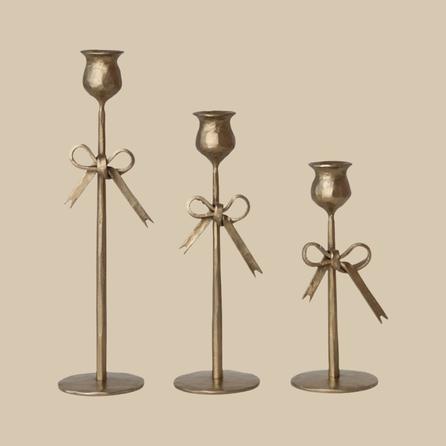 Set of 3 Antique Gold Hand-Forged Iron Iron Taper Holders with Bow