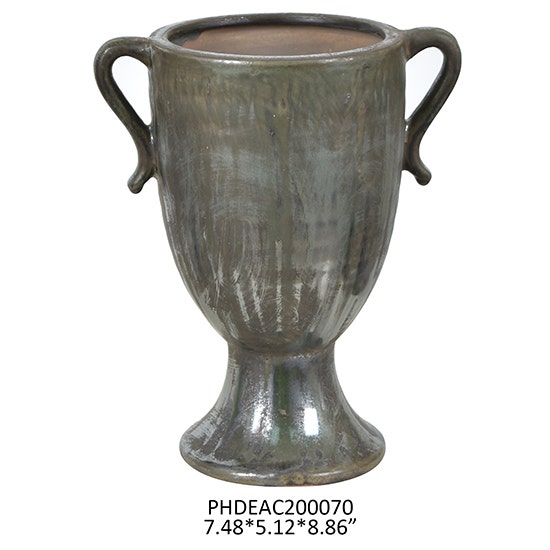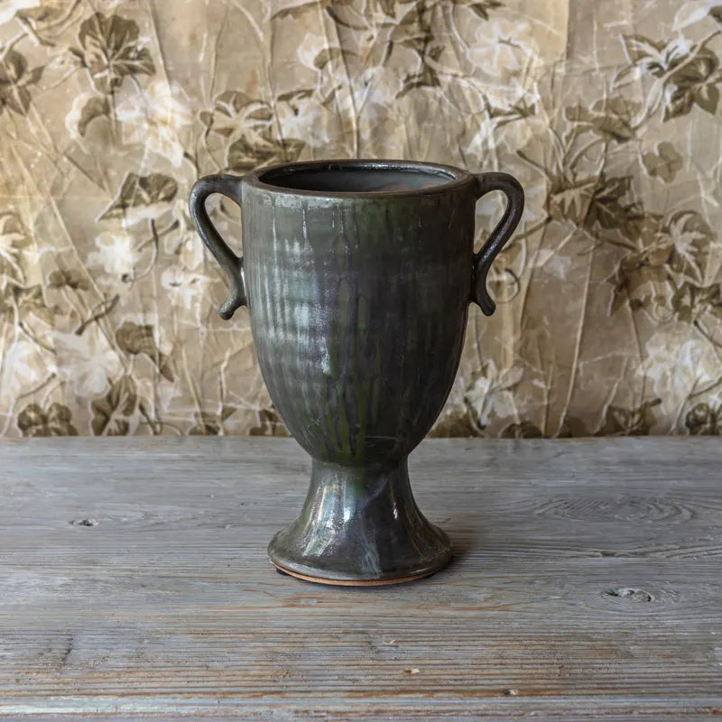 Aged Olive Dripped Glaze Pottery Trophy Vase