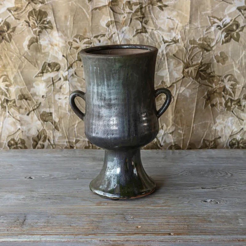 Aged Olive Dripped Glaze Pottery Urn