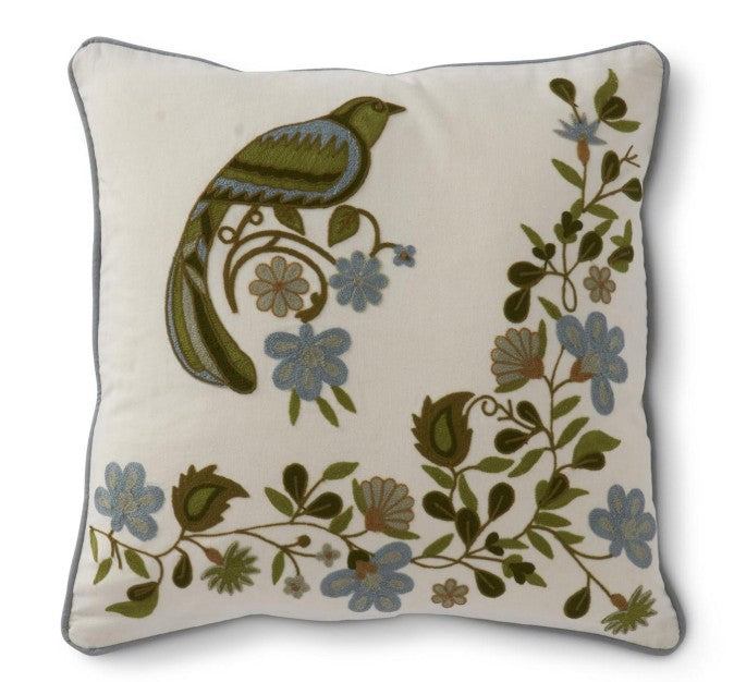 20" Square Blue Green Embroidered Floral and Bird Pillow