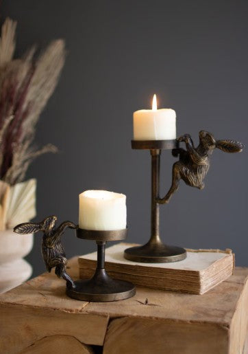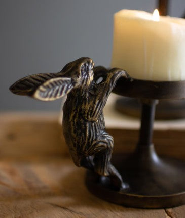 Set of 2 Antique Brass Cast Aluminum Rabbit Candle Holders